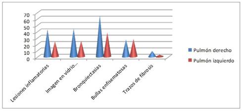La tomografía axial computarizada descartó la existencia de enfermedades neoplásicas, pero se evidenciaron alteraciones radiológicas tales como fibrosis, imagen en vidrio deslustrado, lesiones inflamatorias, bullas enfisematosas y dilataciones bronquiales en 291 pacientes (95,1 %), como lo muestra la figura 1.