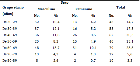 Del total de la serie, 199 eran del sexo masculino (65,0 %) y 107 del femenino (35,0 %). El grupo etario de 60-69 años fue el más representativo, con 79 pacientes, para 25,8 %, seguido del grupo de 40-49 años, con 62, para 20,3 % (tabla 1).