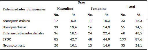 Se comprobó una mayor frecuencia de la enfermedad pulmonar obstructiva crónica (EPOC), seguida de las enfermedades intersticiales y las bronquiectasias, con 87,6; 40,5 y 34,5 %, respectivamente (tabla 2).