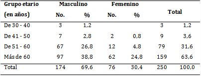 En la serie predominaron los pacientes mayores de 60 años de edad (63,6 %), seguidos de los del grupo etario de 51-60 años (tabla 1), con una mayor frecuencia del sexo masculino (69,3 %).
