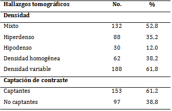 Acerca de las imágenes tomográficas (tabla 2), se describieron primeramente las características relacionadas con la densidad del tumor y, de ahí, se obtuvo una preponderancia de la imagen mixta en 52,8 %. Del total de pacientes, en 188 se observó una densidad no homogénea del tumor, para 61,2 %. Con respecto al medio de contraste, 61,2 % presentaron captación de este.