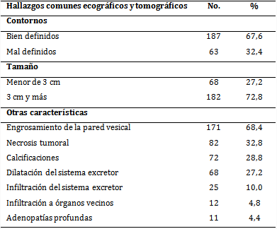 Existen diferentes características comunes que se valoran tanto por medio de la ecografía como de la tomografía (tabla 3), como es el caso de los contornos del tumor, que resultaron bien definidos en 187 pacientes, para 67,7 %. En cuanto al tamaño, en 72,8 % de los casos medía 3 cm y más. El engrosamiento de la pared vesical, la necrosis intratumoral y las calcificaciones fueron las de mayor incidencia. Además de las características propias del tumor, existen otras complicaciones a distancia, como la dilatación del sistema excretor, que estuvo presente en 27,2 %, y la presencia de adenopatías profundas, en 4,4 % de los pacientes.