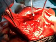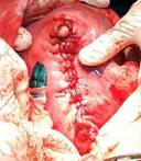 De inmediato se efectuó la ligadura de dicha base y luego la extirpación del mioma con compresas húmedas, previo aislamiento del útero grávido. Dicho proceder se realizó con la menor manipulación posible sobre el útero grávido. Luego de la miomectomía se constató una delgada capa muscular que mantenía íntegra la cavidad uterina (fig. 2); se dieron puntos con catgut cromado, 1 en 2 planos (fig. 3).