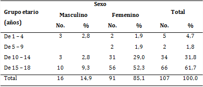 En los pacientes con intoxicación exógena predominaron el sexo femenino, con 85,1 %, y el grupo etario de 15-18 años, con 61,7 % (tabla 1).