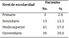 La mayoría los padres y/o tutores de los integrantes de la serie tenía un nivel medio superior de escolaridad (tabla 2), seguido del universitario, con 57,0 y 28,0 %, respectivamente. Solo 16 padres y/o tutores poseían bajo nivel de instrucción (enseñanza primaria o secundaria básica no concluida), lo que representó 14,9 %.