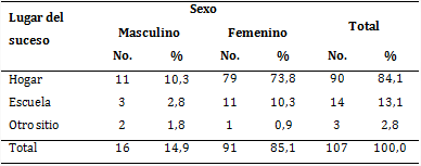 Respecto al lugar donde ocurrió la intoxicación (tabla 3), mayormente fue en el hogar, con 90 pacientes, para 84,1 %, y en segundo lugar en la escuela, con 14 afectados, para 13,1 %.