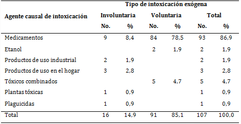Como ya se mencionó, las intoxicaciones exógenas pueden ser involuntarias o voluntarias; en los adolescentes predomina la intoxicación voluntaria, expresada como un intento suicida, en tanto las de tipo accidental (o involuntaria) son más comunes en niños, específicamente en menores de cinco años; muchos estudios dan prueba de ello.7,8,9,11 Lo obtenido en esta casuística se correspondió con lo anterior; sin embargo, difirió de lo expuesto por algunos autores ecuatorianos.17