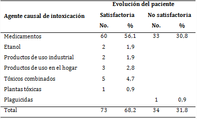 Resultados: Las intoxicaciones presentaron una elevada incidencia en el grupo etario de 15-18 años (61,7 %) y en el sexo femenino (85,1 %); la mayoría se produjo de modo voluntario (85,1 %), principalmente en el hogar (84,1 %) y con predominio de los medicamentos como agente causal (86,9 %). La evolución clínica resultó ser satisfactoria en 68,2 % de los pacientes; en el resto no fue así debido a la aparición de complicaciones, sobre todo de gastritis medicamentosa (30,8 %).