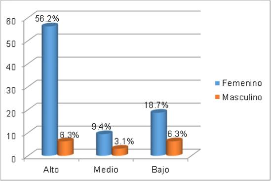 La figura 1 muestra que 75,0 % de los profesionales de enfermería presentaron agotamiento físico (niveles alto y medio). La sumatoria del agotamiento alto, medio y bajo arrojó que el sexo femenino fue el más frecuente (84,3 %), con predominio del nivel alto de agotamiento en 56,2 % de los afectados.