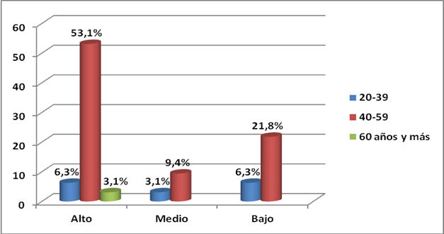 El agotamiento físico profesional se presentó en 75,0 % de los enfermeros con niveles alto y medio; el grupo etario de mayor prevalencia fue el de 40-59 años de edad con primacía del nivel alto en 53,1 % (fig.2).