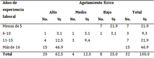 Como se observa en la tabla 1, el agotamiento físico se presentó con mayor frecuencia en los profesionales de enfermería con más de 16 años de experiencia laboral (46,9 %), donde predominó la clasificación de agotamiento físico alto; seguido por el grupo de 11-15 años de experiencia con 21,9 % entre los niveles alto y medio.