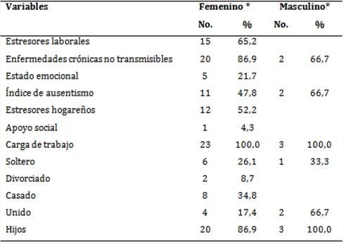En la tabla 2 se relacionan los estresores que influyeron en el agotamiento físico profesional con predominio de la carga de trabajo (100,0 %). De los 32 profesionales que trabajaban en la UCIA, 23 tenían hijos y 22 presentaban enfermedades crónicas no transmisibles, tales como: tensión arterial, diabetes mellitus, hipertiroidismo y problemas ginecológicos, que predominaron en las féminas (86,9 %).