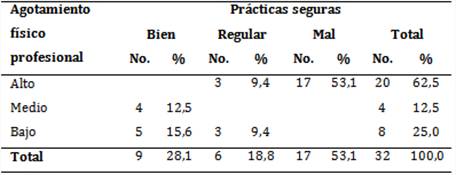 Se halló, que de 24 profesionales con agotamiento físico alto y medio, 53,1 % fueron calificados de mal y 18,8 de regular, con un valor de medidas simétricas de gamma de -0,901 y coeficiente de significación de 0,000 (tabla 3).