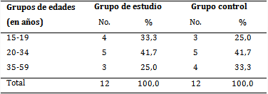 En la casuística (tabla 1), predominó el grupo etario de 20-34 años, con 5 pacientes en cada grupo (41,7 %, respectivamente), por lo que existió homogeneidad entre ambos con respecto a la edad (p>0.05).
