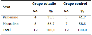 Como puede observarse (tabla 2) prevalecieron los hombres (8, para 66,7 % en el grupo de estudio y 7, para 58,3 % en los controles), lo cual indica que esta variable se distribuyó de forma homogénea (p ≥ 0,05).