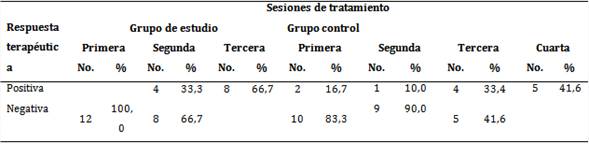 Para los pacientes del grupo de estudio, la segunda y tercera sesiones de tratamiento resultaron ser más efectivas, pues al final de estas todos tuvieron respuesta positiva; sin embargo, 5 de los controles (41,7%) necesitaron una cuarta sesión para lograr el resultado esperado (tabla 3).