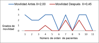 Al analizar la movilidad dentaria, se observó que de los 8 adultos que la padecían antes de aplicar el PRP, solo 3 la mantenían luego de ser tratados, aunque en grado menor, pero en 5 desapareció, pues la media de movilidad disminuyó de 2,0 a 0,45 (fig. 1).
