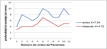 Así mismo se redujo la profundidad de las bolsas periodontales asociadas a las lesiones, con una media que varió de 7,54 a 4,72 mm después del tratamiento con PRP (fig. 2). Un solo integrante de la serie presentó bolsas de más de 6 mm, las cuales habían disminuido en 3 mm su valor inicial.