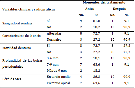 Results: In the series, bleeding on probing (81.8 %), altered characteristics of the gums (72.7 %), dental mobility (72.7 %) and 7 to 9 millimeters periodontal bags, with bony loss in the third apical (63.6 %) were more frequent before therapy; all of which was reverted to lower percentages after 6 months of treatment.