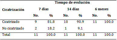Respecto al tiempo en que cicatrizaron las lesiones (tabla 2), a los 7 días 81,8 % ya presentaba cicatrización si se tiene en cuenta que en ese período solo se evalúa la recuperación de las características clínicas normales de la encía tras la operación periodontal. La demora en la curación de 3 pacientes se debió a la persistencia de fístulas. A los 6 meses habían sanado las lesiones en el total de la serie.