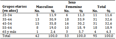 En el estudio (tabla 1) prevaleció el sexo femenino en relación con el masculino (53 y 42 pacientes, respectivamente), con una razón aproximada de 1:2 y los grupos etarios de 35-44 y de 45-54 años con 31 afectados cada uno (32,6 %).