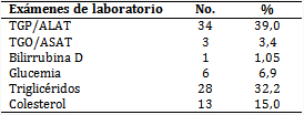 Las pruebas de laboratorio mayormente alteradas (tabla 2) fueron la TGP/ALAT (39,0 %) y los triglicéridos (32,2 %). Cabe destacar que en la química sanguínea hubo estudios que no mostraron variación, tales como la gammaglutamil-tanspeptidasa, la fosfatasa alcalina, las proteínas totales y fraccionadas, así como el coagulograma completo.