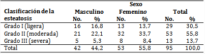 Con referencia a los hallazgos ecográficos (tabla 3) se observó un predominio significativo de la esteatosis de grado II o moderada en 53 pacientes (55,8 %), la mayoría del sexo femenino.