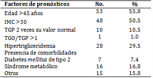 Se tuvieron en cuenta los factores pronósticos siguientes: edad mayor de 45 años, índice de masa corporal mayor de 30 (obesidad), TGP 2 veces su valor normal, hipertrigliceridemia, presencia de comorbilidades: diabetes mellitus de tipo 2, síndrome metabólico, apnea del sueño y la categoría de otros (presencia de más de 4 factores pronósticos).