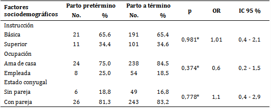 El parto pretérmino se presentó en 9,8 % de las madres jóvenes. En la tabla 1 se aprecia que las proporciones estimadas para la instrucción, ocupación y el estado conyugal, no mostraron diferencias significativas entre ambos grupos.
