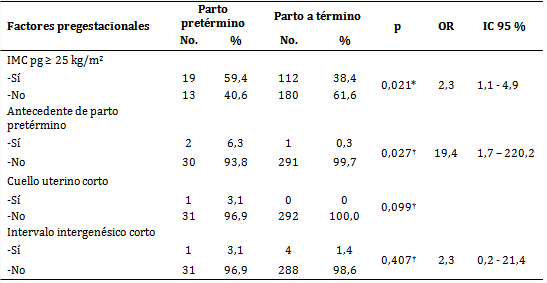 Conclusiones: El índice de masa corporal pregestacional ≥25 kg/m2, el antecedente de parto pretérmino, la infección urinaria, la rotura prematura de membranas y la preeclampsia, incrementaron significativamente el riesgo de parto pretérmino.
