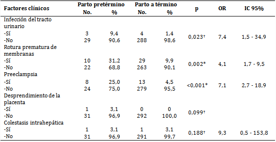 En el análisis de los factores clínicos se observó que la infección urinaria (9,4 %), la rotura prematura de membranas (31,2 %) y la preeclampsia (25 %) fueron más frecuentes en las madres con parto pretérmino y, a su vez, representaron un riesgo significativo para este tipo de parto (p<0,05; OR>1). Por otro lado, las proporciones de exposición al desprendimiento prematuro de placenta y a la colestasis intrahepática no demostraron diferencias significativas entre los grupos de estudio (tabla 3).