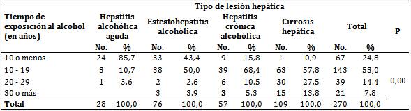 La tabla 1 muestra las lesiones hepáticas en los pacientes según el tiempo de consumo del alcohol y puede apreciarse que 109 (40,4 %) tenían diagnóstico de cirrosis hepática, siendo esta la forma más común, seguida de la enfermedad hepática grasa presente en 76 afectados (28,1 %); en ambos casos el tiempo de exposición al alcohol estuvo entre 10 y 20 años. También se observó que de 21 pacientes con más de 20 años de exposición al tóxico, 15 presentaron cirrosis hepática.
