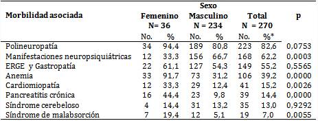 Según la comorbilidad asociada (tabla 2) se observó que la polineuropatía (223 para 82,6 %) y las manifestaciones neuropsiquiátricas (168 para 62,2 %) fueron las afecciones predominantes, seguidas de la enfermedad por reflujo gastroesofágico junto a las gastropatías, presentes en 149 pacientes (55,2 %) y las anemias en 106 de ellos (39,2 %), las cuales fueron principalmente de causa carencial en 82 afectados, con forma de megaloblastosis; en tanto, se demostró la existencia de ferropenia en 33 pacientes y de sangrados agudos por lesiones de la mucosa gástrica o esofágica recientes, gastropatía por hipertensión portal o sangrado por várices en 11 personas.