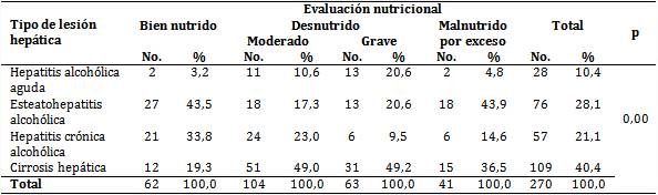 Entre el estado nutricional y el grado de lesión hepática existe una elevada correspondencia, demostrada estadísticamente. Este hecho ha sido descrito en un estudio publicado en 2014, donde se evaluó a pacientes con cirrosis hepática y se demostró una tasa de desnutrición elevada, con mayor evidencia y gravedad en quienes presentaban causa alcohólica, con una importante afectación de los parámetros de laboratorio. El estado nutricional deplorable se relacionó con las formas evolutivas más avanzadas de la enfermedad.20 Estos resultados concuerdan con los de esta serie donde se halló que al mismo tiempo las formas de desnutrición más graves se relacionaron con las formas evolutivas más graves de la enfermedad; es decir, el estadio de cirrosis hepática como etapa final y el estado inicial de hepatitis alcohólica.