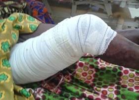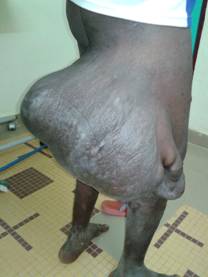 Se describe el caso de una fémina de 36 años de edad, de raza negra y procedencia rural, quien fue remitida al Servicio de Cirugía del Centro Hospitalario del Distrito Sanitario Norge-Massom, Kossodô, en Burkina Faso, por presentar un tumor gigante en la región posterior del muslo de la pierna derecha, unido a dolor y ulceraciones en la piel que cubría la masa tumoral, lo que le dificultaba la marcha y la posición bípeda erguida.