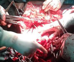 La paciente fue intervenida quirúrgicamente de manera electiva. Se le colocó en posición contralateral y se administró anestesia epidural continua; como parte del procedimiento técnico se controló la hemostasia con torniquete arterial neumático regulado en la base del muslo, el que fue utilizado en intervalos de 15 minutos de isquemia por 20 de reperfusión, a presiones de 95-100 mm de Hg, lo que permitió realizar en un tiempo de 2,30 la disección minuciosa con esqueletización del nervio ciático en su trayecto troncular y la extirpación de todo el tumor (fig. 2), cuyo peso excedió los 22,5 kg. No se dañaron otras estructuras de la pierna ni la integridad del nervio o sus ramas, y además se reconstruyó el tercio superior del miembro, todo lo que garantizó su motilidad y sensibilidad.
