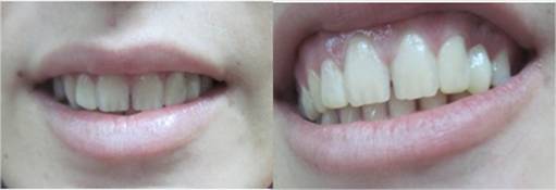 Finalmente se remitió a prótesis, donde fue rehabilitada la brecha edente en la zona del canino superior izquierdo (23). Además, se realizó la restauración estética de incisivos laterales superiores (12 y 22) por microdoncia con resina fotopolimerizable, lo cual favoreció la rehabilitación estética y funcional de la paciente, así como contribuyó a mejorar su calidad de vida (fig. 3).