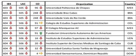 Observe en la figura 2, que la Universidad de Ciencias Médicas de Santiago de Cuba, con el nombre de Instituto Superior de Ciencias Médicas ocupa en Iberoamérica el lugar 604 y en Latinoamérica el 506. Por su parte, entre las instituciones nacionales tiene el puesto 20.