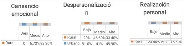 Al analizar los componentes del burnout teniendo en cuenta la procedencia de los cuidadores (fig.) se observó, que el cansancio emocional fue mayor en cuidadores procedentes del sector rural (93,3 %); sin embargo, los niveles de despersonalización resultaron moderadamente mayores en el los habitantes del sector urbano (49,9 %). La realización personal fue más baja en las personas residentes en el sector rural con 23,4 %.