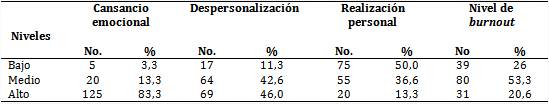 El nivel de burnout resultó de medio a alto en más de 70,0 % de los cuidadores y el componente cansancio emocional alto fue el más frecuente (83,3 %), seguido de la despersonalización. Asimismo, la realización personal se consideró de baja a media en más de 85,0 % de los encuestados (tabla 1).