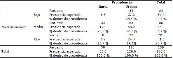 En relación con la procedencia de los cuidadores se observó, que los del sector rural presentaron con mayor frecuencia niveles de burnout medio y alto, con 73,3 y 26,7 % respectivamente (tabla 2).