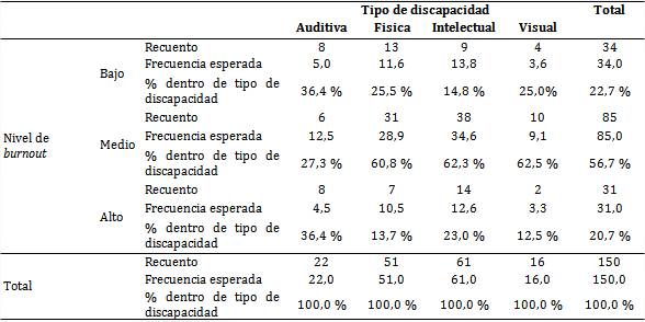 Respecto al tipo de minusvalía en los individuos objeto de cuidado, se pudo observar la presencia de discapacidades auditiva, física, intelectual y visual. Se comprobó que existieron diferencias entre los grupos en cuanto al nivel de agotamiento presente; sin embargo, no se registró el grado de discapacidad de los implicados, lo cual limita contrastar los resultados de acuerdo con el tipo de discapacidad. No obstante, al asociarse ambas variables se determinó que eran dependientes (p= 0,049).