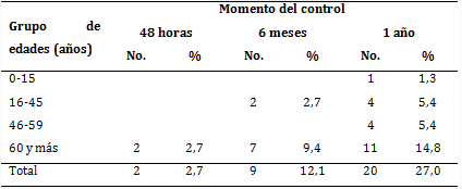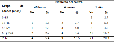 Se observó hipercoloración de la mucosa en 28 pacientes en 34 momentos de los exámenes clínicos. El mayor número se halló al año de implantada la prótesis ocular, con 12 pacientes (16,2 %) de 60 y más años de edad, de los cuales 6 tuvieron episodios recurrentes y en 5 concomitaron las secreciones (tabla 2).