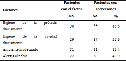 Entre los factores que puedan guardar relación con las manifestaciones clínicas descritas, se valoraron la higiene diaria de la cavidad y de la prótesis ocular, las condiciones ambientales inadecuadas y las alergias. Se observó que 31 de los pacientes vivían en un ambiente inadecuado, de los cuales 11 (35,4 %) tuvieron secreciones conjuntivales; le siguieron en menor frecuencia los pacientes con alergia al polvo (22 de ellos). Más de 45,0 % de los que higienizaron diariamente la prótesis y la cavidad ocular presentaron secreciones (tabla 3).