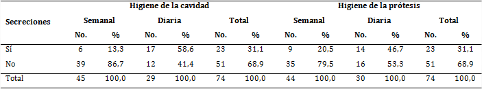 Results: Of the 222 exams made to the rehabilitated ocular cavities, 31 revealed the presence of secretions in 23 patients, with recurrence in 8 of them; this clinical sign became evident in a similar way to the hypercoloring of the conjunctiva as for the moment of the finding and the age group affected, with higher percentages at the year of evolution and a higher incidence in the patients of 60 years and over. Also, an association statistically significant of the daily hygiene of the cavity and prosthesis variables with the existence of secretions was verified, for a confidence interval of 95 %.