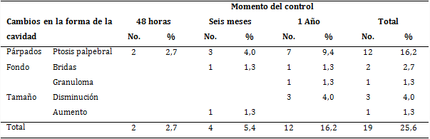 Asimismo, se identificaron las modificaciones de la cavidad en tres momentos del año, en cuanto a su tamaño y forma, y posición de las prótesis; también se valoró la opinión del paciente, quien es un riguroso observador de su rostro, la aparición de lesiones en el fondo de la cavidad anoftálmica y los cambios en el tono muscular de los párpados. Estas modificaciones se tomaron solo en el momento inicial de la deformación. La mayor incidencia en los cambios de la cavidad apareció al año de colocada la prótesis y la parte más afectada la constituyeron los párpados, con pérdida de tono y borramiento del pliegue palpebral (ptosis palpebral). Ningún caso con ptisis bulbis presentó este signo. Las modificaciones más notables respecto al tamaño se apreciaron en 4 pacientes: uno menor de un año (2 meses), portador de un conformador, en el que se observó aumento de la cavidad a los 6 meses en correspondencia con el crecimiento facial, y los tres restantes presentaron contracción del fondo de la cavidad, lo que provocó un aspecto hundido de la prótesis, que fue notado por los propios pacientes (tabla 5).