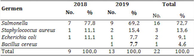 Según se muestra en la tabla 1, la Salmonella constituyó el principal agente bacteriano aislado en muestra de coprocultivos (72,7 %), seguida del Staphylococcus aureus y la Escherichia coli en porcentajes muy inferiores. Los resultados individuales muestran variaciones en la frecuencia entre los años, excepto en el caso de la Escherichia coli. Resultó importante el hallazgo de 7,7 % de aislamientos de Bacillus cereus en 2019, principalmente a partir de carne y derivados, pues no se estudiaron los granos y cereales. De forma genera, esta bacteria representa 4,6 % del total de los microorganismos identificados.