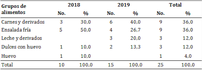 Los principales grupos de alimentos relacionados con la aparición de los brotes de ETA (tabla 2) resultaron ser la carne y sus derivados ―con 36,0 % de los brotes en todo el período, además de 30,0 y 40,0 % en cada año estudiado― y la ensalada fría, entre otros.