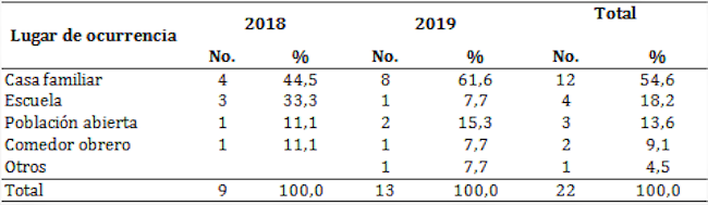 Como lugar de ocurrencia de los brotes (tabla 3) sobresalieron las casas familiares (54,6 %), las escuelas (18,2 %) y la población abierta (13, %).
