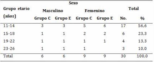 En la serie predominaron el grupo etario de 11-14 años, con 56,6 %, y el sexo femenino, con 60,0 %; este último se encontraba distribuido de forma equitativa con 9 integrantes en cada grupo (tabla 1).